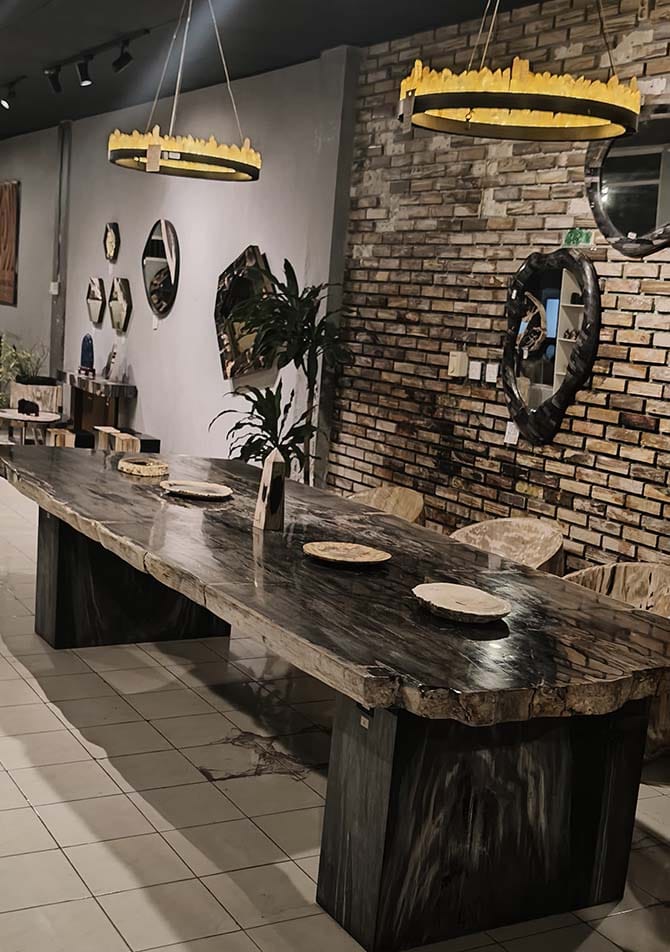 Manufactured at industrial scale in Bogor, West Java, our petrified wood dining tables are engineered for hospitality installations, architectural projects, and container-based wholesale distribution.