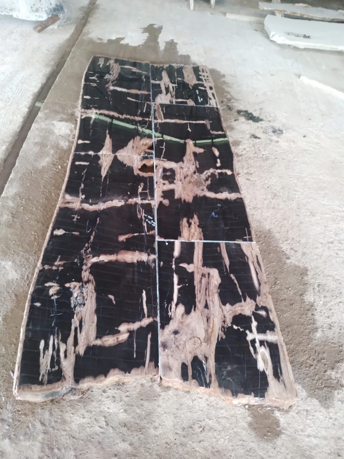We process fossil logs up to approximately 5 meters using water-cooled diamond saw systems and produce large-format dining slabs exceeding 800 kilograms.